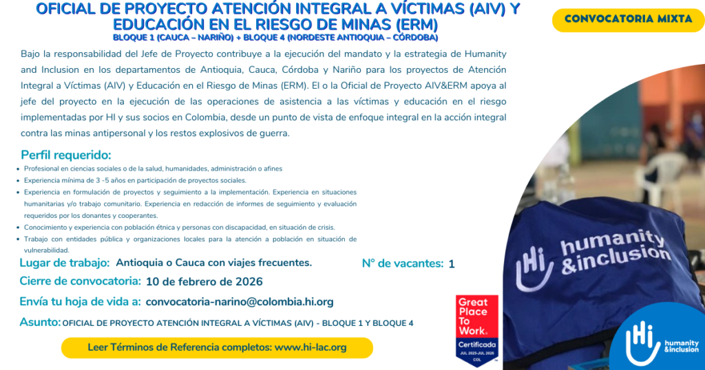 03 Feb Colombia, Convocatorias Oficial de Proyecto Atención Integral a Víctimas (AIV) Y Educación en el Riesgo de Minas(ERM) febrero 3, 2026 By [email protected] 0 comments Continue reading