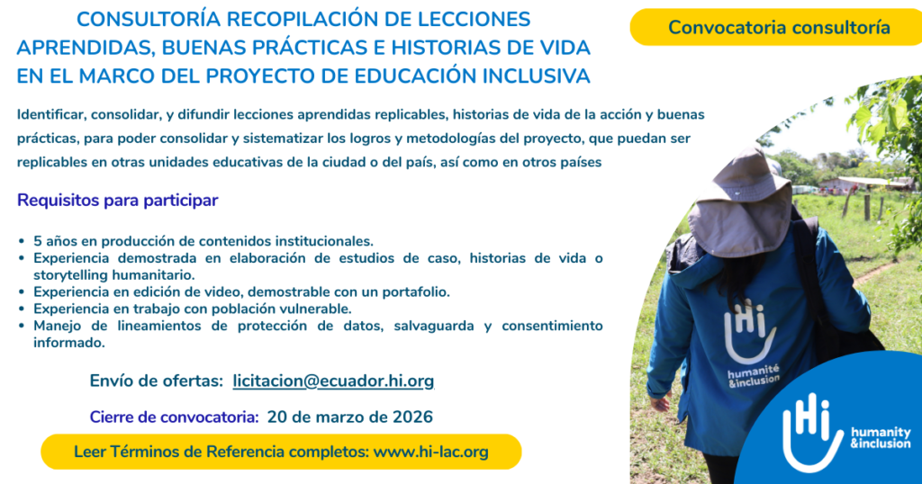 10 Mar Ecuador, Licitaciones Consultoría para la recopilación de lecciones aprendidas, buenas prácticas e historias de vida – Ecuador marzo 10, 2026 By [email protected] 0 comments ETAPA FECHA Solicitud de Cotización y publicación de TDR 10 de marzo de 2026. Recepción de consultas e inquietudes:...Continue reading